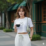Outfit: She wears a white round-neck crop top featuring a cute cat face illustration on the front. She pairs it with thick white jogger pants, drawstring waist, tied with a light-green ribbon at the front.