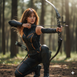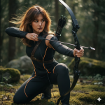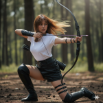 Movement: The model is captured mid-action, in the act of drawing her bow. Her arms are extended, one holding the bow firmly and the other pulling back the string with an arrow nocked, creating tension and a sense of impending release. Her body is slightly rotated, adding to the dynamism. Body Pose: She is in a kneeling or crouched stance, with one knee on the ground and the other leg bent, ready to push off. Her torso is slightly twisted, showing core engagement, and her shoulders are broad and strong, emphasizing her athletic build. The pose is stable yet full of potential energy.