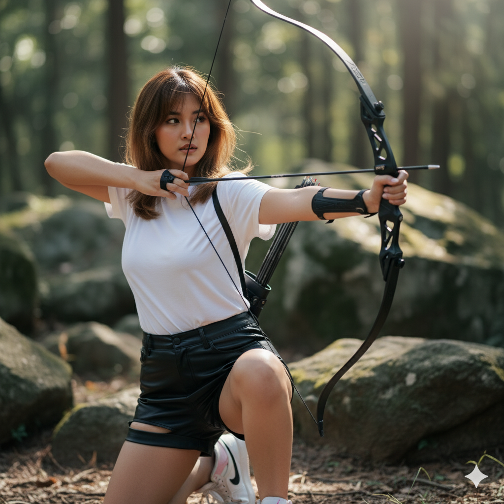Movement: The model is captured mid-action, in the act of drawing her bow. Her arms are extended, one holding the bow firmly and the other pulling back the string with an arrow nocked, creating tension and a sense of impending release. Her body is slightly rotated, adding to the dynamism. Body Pose: She is in a kneeling or crouched stance, with one knee on the ground and the other leg bent, ready to push off. Her torso is slightly twisted, showing core engagement, and her shoulders are broad and strong, emphasizing her athletic build. The pose is stable yet full of potential energy.