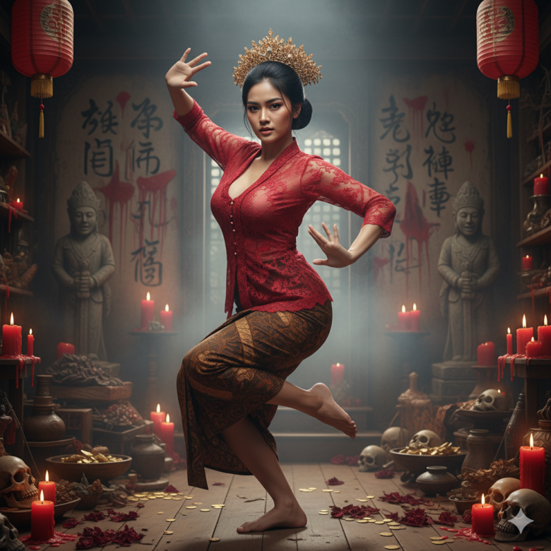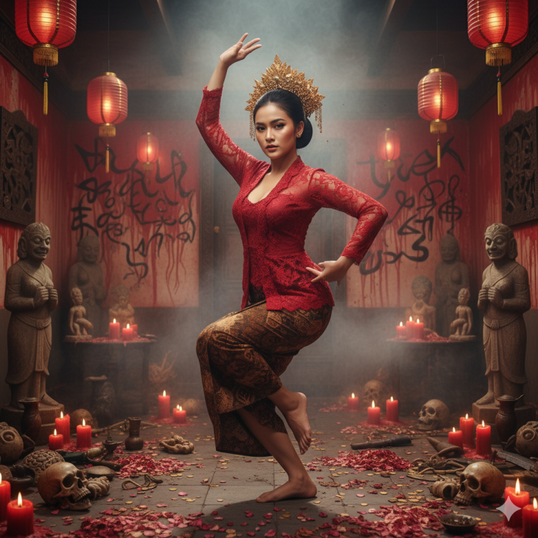 The background is an old antique room full of skulls, flower petals and gold coins scattered around, piles of mysterious items, typical Indonesian occult symbols and many calligraphy writings with foreign shapes on every wall red from melted paint, scary statues, red lanterns above her and red candles lined up.