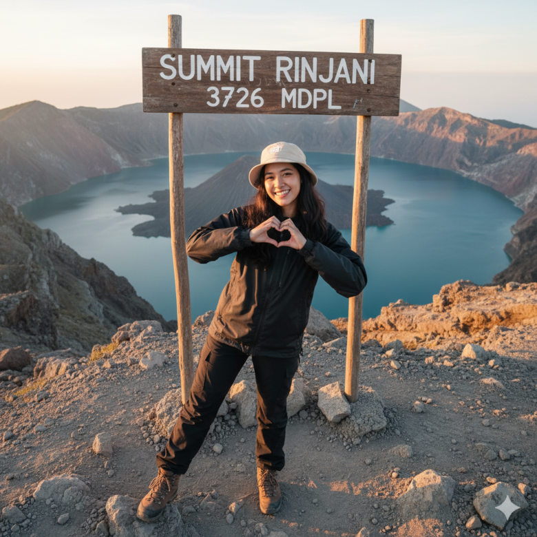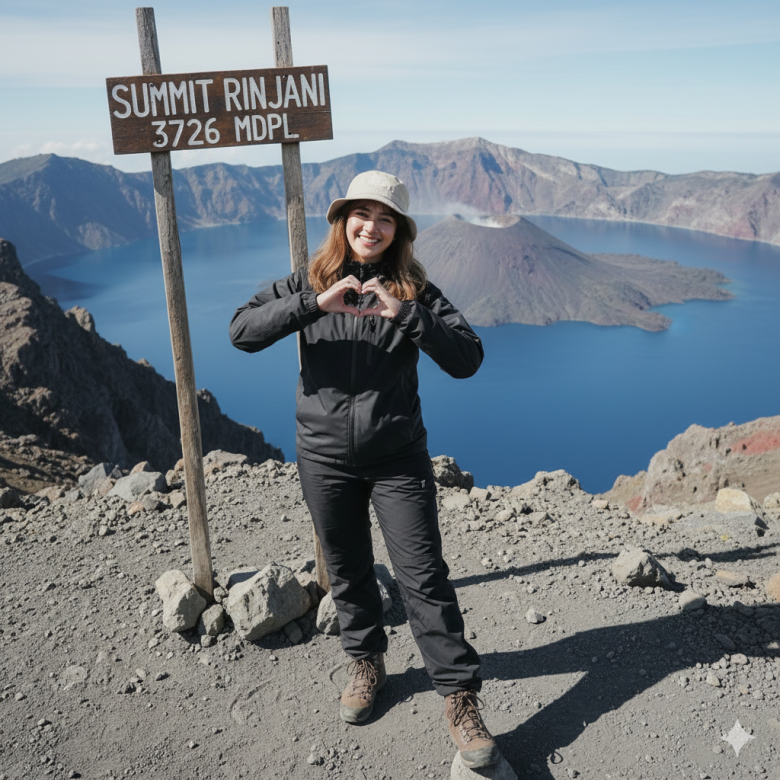 She stands on rocky ground with one leg straight and the other slightly lifted, while both hands form a heart shape. Above her head is a wooden signboard that reads “SUMMIT RINJANI 3726 MDPL” in white letters. Her face is turned toward the camera with a cheerful, joyful smile.