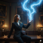 Make person in the picture ultra realistic without changing original facial details. A young adult woman seated in some chairs, indoors, likely in a richly decorated room, and appears to be conjuring or interacting with intense blue, electrical-looking energy. The woman is positioned in the center-left of the image, seated on what looks like a large, dark wooden table or piece of furniture. He is wearing a formal black suit, including a jacket, and trousers which suggests an upper-class or traditional setting. His posture is dynamic: he is leaning slightly back, looking upward and to the right, with she right hand raised, palm open and facing up, directly into a stream of bright, luminous massive blue energy that ewomanates from she hand and rises toward the top of the frame, resembling smoke, fire, or plasma and then spreads everywhere massively throughout the room