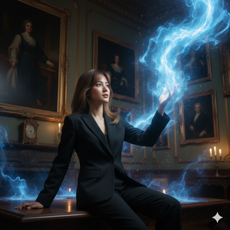 Make person in the picture ultra realistic without changing original facial details. A young adult woman seated in some chairs, indoors, likely in a richly decorated room, and appears to be conjuring or interacting with intense blue, electrical-looking energy. The woman is positioned in the center-left of the image, seated on what looks like a large, dark wooden table or piece of furniture. He is wearing a formal black suit, including a jacket, and trousers which suggests an upper-class or traditional setting. His posture is dynamic: he is leaning slightly back, looking upward and to the right, with she right hand raised, palm open and facing up, directly into a stream of bright, luminous massive blue energy that ewomanates from she hand and rises toward the top of the frame, resembling smoke, fire, or plasma and then spreads everywhere massively throughout the room