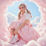 Mood & Atmosphere of the Photo: The atmosphere created is fantasy-like, sweet, and soft like a dream. The mood is innocent, cute (kawaii), and calm. The photo’s atmosphere is very bright, pastel, and surreal, as if the subject were in heaven or on cotton clouds.