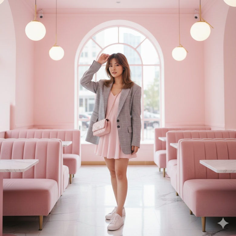 She wears a stylish outfit: a light gray plaid oversized blazer layered over a soft pink short dress. She carries a small light pink chain shoulder bag and wears clean white sneakers.