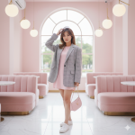 The lighting is bright and diffused, evoking an elegant, feminine, and modern atmosphere. The photo is taken full body at eye level, with soft shadows, realistic texture, high dynamic range, and cinematic color tone. The overall mood feels fashionable, calm, and confident, reflecting a blend of modern aesthetic and pastel chic design.