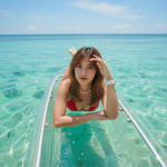 Create a hyper realistic image using the photo attached. Don’t change my face. A woman is lying face down on a transparent crystal kayak floating on clear turquoise water under bright tropical sunlight. She supports her upper body with her elbows and forearms, her right hand raised slightly to shield her eyes from the sun while looking toward the camera with a relaxed, confident expression. Her pose is casual yet elegant, giving off a candid, summery vibe. She is wearing a two-piece swimsuit — an red bikini bottom paired with a red bikini top — accessorized with gold bracelets, a smartwatch, and a white shell necklace. Her long straight hair is slightly tousled by the sea breeze, adding to the natural beach look. The background shows the open ocean and a faint horizon line under a vivid blue sky with soft, scattered clouds. The sunlight reflects beautifully on the kayak’s surface and the water below, creating ripples and shimmering highlights that emphasize the crystal-clear tropical setting. The overall scene feels bright, serene, and adventurous — capturing the essence of a Boracay vacation moment on the water.
