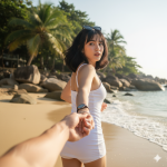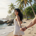Ultra-realistic 8K DSLR photo, 9:16 vertical frame, with cinematic depth of field. A young woman, her hair long, black, and styled in a messy bob, runs, looking back on a beach with rocks, coconut trees, and trees in the hot afternoon sun. Her hand is held by a muscular European man, whose veiny hands are visible from behind the camera. She is wearing a black leather watch.