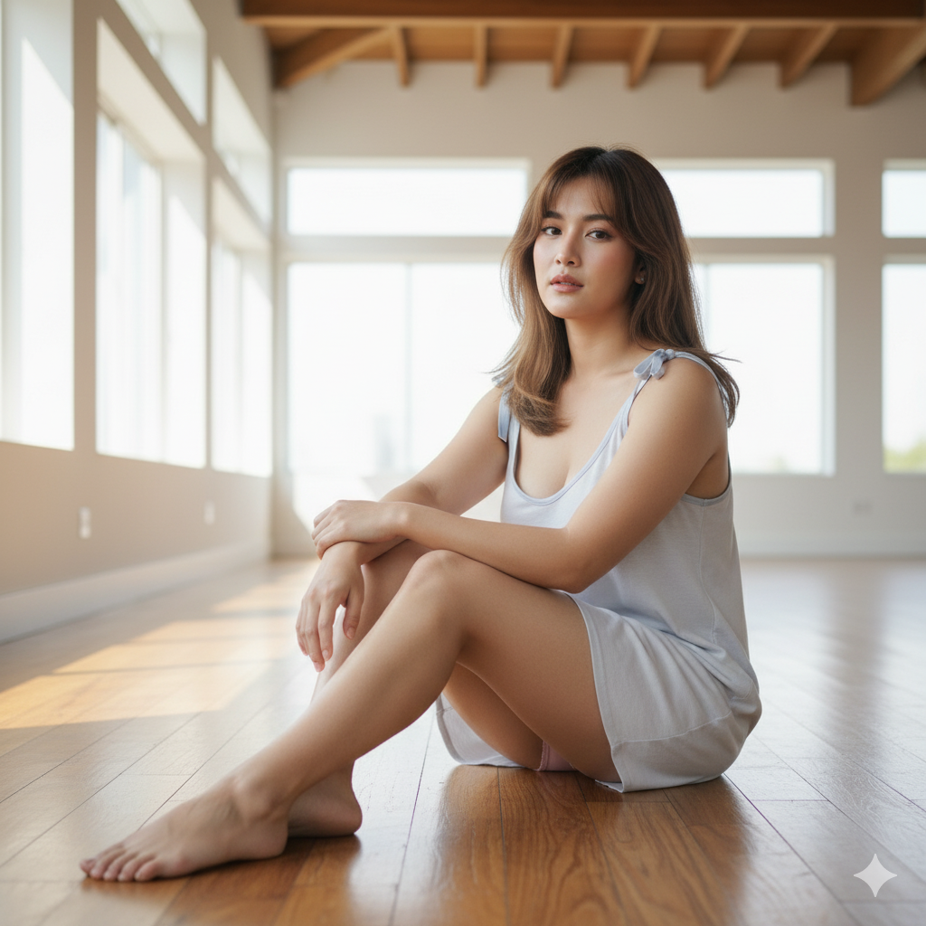 A real-life 25-year-old woman, 160cm tall, 55kg weight. The hair has a natural texture, parted slightly off-center, framing her face softly. Her chest size is big and large. She is seated on a warm, light brown wooden floor. Her left leg is crossed in front of her with the knee slightly raised, while her right leg is extended straight forward at a slight angle. Her bare feet are relaxed on the floor. Her left arm is casually draped over her left knee, while her right hand gently rests on her left arm.