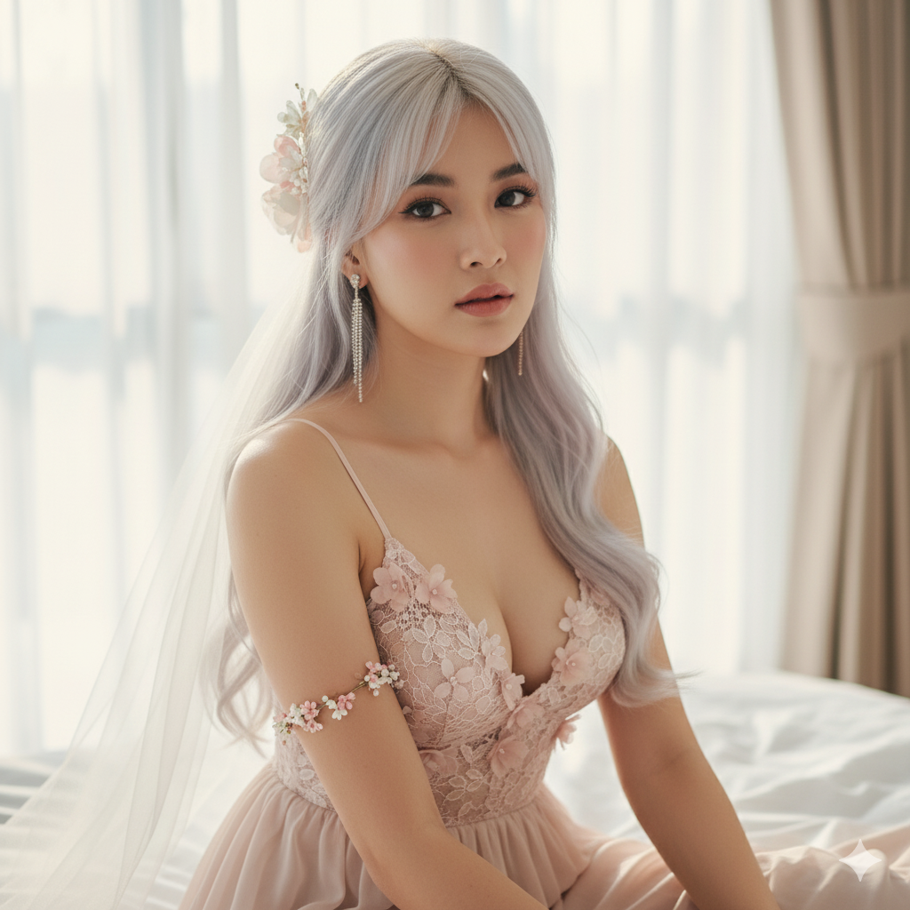 Pose & GestureThe model sits comfortably on a white bed, leaning slightly forward toward the camera to create an intimate, fine art composition.Her expression remains calm and tender, with a faint pout suggesting introspection or gentle emotion.Her shoulders and neckline are visible, emphasizing an elegant upper-body silhouette.