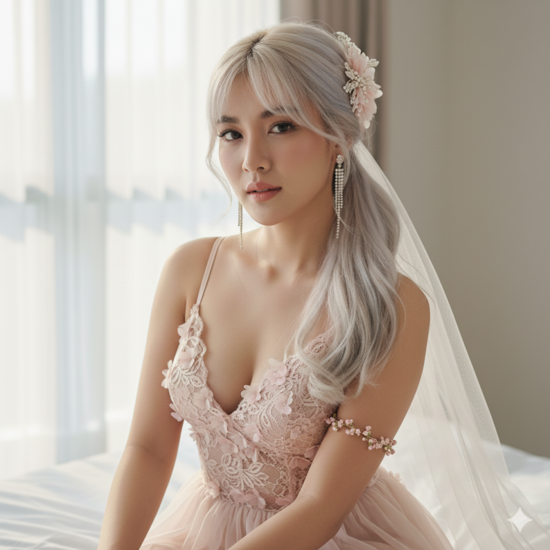 Accessory: A large 3D floral hair clip in soft pastel pink and white decorates the ponytail base, with a thin milky-white translucent veil tucked underneath, cascading down her back.