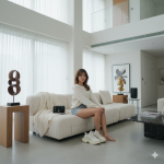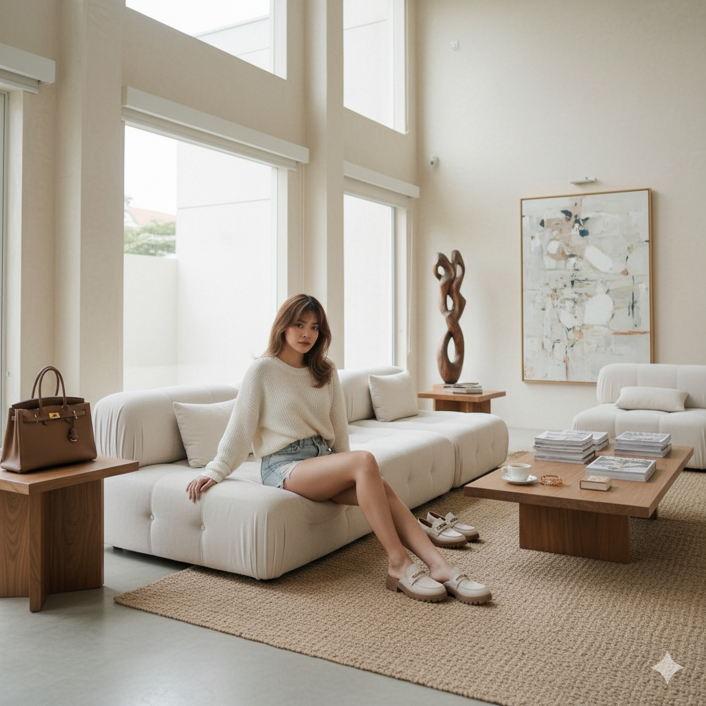 Create a picture of a [upload photo] wearing a pastel cream sweater and very short denim pants. She sits on a sofa in her very grand, minimalist Indonesian home, adorned with expensive branded goods