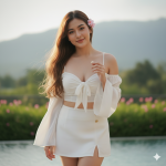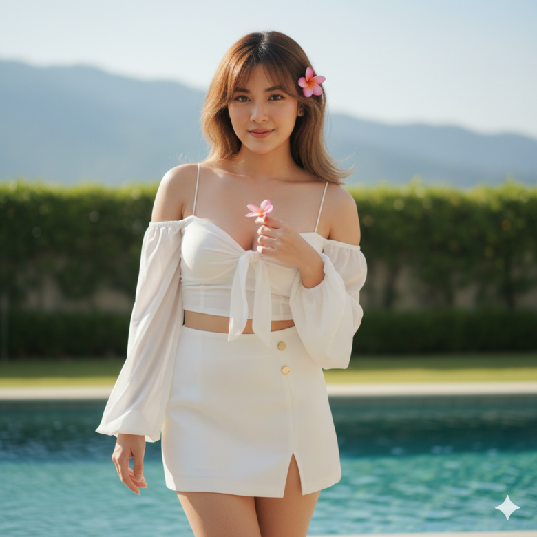 Top: A white, off-the-shoulder, long-sleeved crop top made of light, flowing fabric (possibly chiffon or a soft cotton blend). The sleeves are wide and billowy, gathering at the wrists but also designed to drape off the shoulders, revealing the upper décolletage. The front of the top features a bow-tie closure at the bust, creating a subtle sweetheart neckline beneath the tie. A thin, delicate strap is visible on her left shoulder, suggesting an underlying bra or camisole in a matching white tone. The fabric has a soft, slightly sheer quality in direct sunlight, revealing the subtle contours of her form without being overtly revealing.
