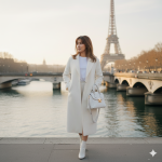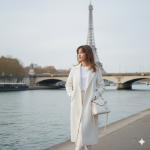 Change the background of this photo to a morning Paris background, with the Eiffel Tower, the Seine River, and the famous Bir-Hakeim Bridge. She is walking while looking at the Seine River with a firm and elegant posture, her smile mysterious. Both of her hands are inside the pockets of the long white coat she is wearing. In the inner fold of her left arm, she is carrying a white Louis Vuitton bag. She is walking but her eyes are not looking toward the camera; instead, they are looking toward the Seine River. The angle is taken from the front, but her face is still visible from the camera, and she continues wearing the same outfit. Add white boots to make her look more elegant. Do not change the facial details. Make the photo close-up but still showing her face and full body.