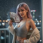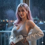 Lighting: Cold light, bokeh city rain reflection. Vibe: Melancholic, sensual, introspective calm. Style: Ultra-realistic, with a soft and aesthetic sensual tone, warm lighting, and focus on facial expression.