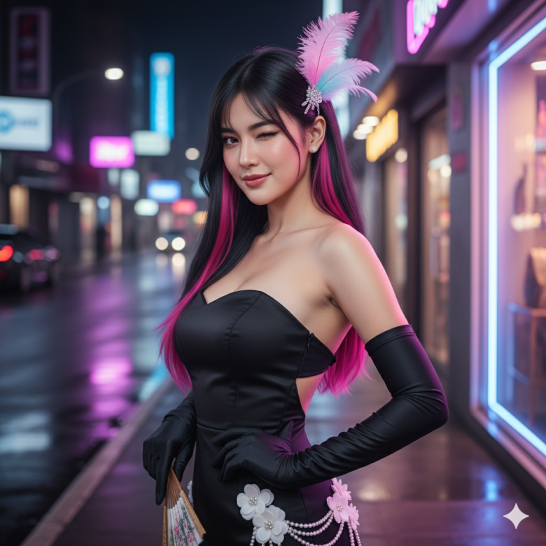 Create ultra realistic image of me, around 22 years old, with a natural and proportional body shape, thin yet sensual lips, a slim nose, sharp-shaped eyes, a beautiful, sweet, and cute face, and very fair skin. She has long straight black hair with bright, striking magenta-pink strands.