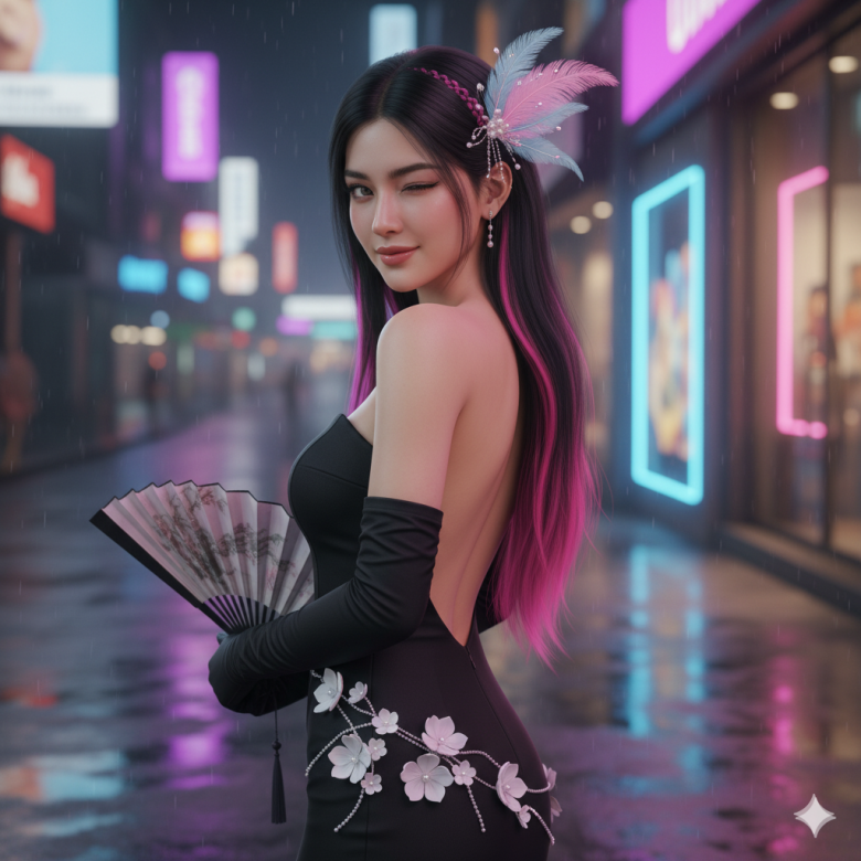 She stands gracefully, holding an oriental fan in one hand while the other hand rests confidently on her waist. Her gaze is innocent yet playful, with a soft smile. Her shoulders tilt toward the camera, head slightly lowered, and she gives a charming wink. Her eyes are half-closed, giving a flirty and playful look, with a small smile directed toward the camera.