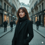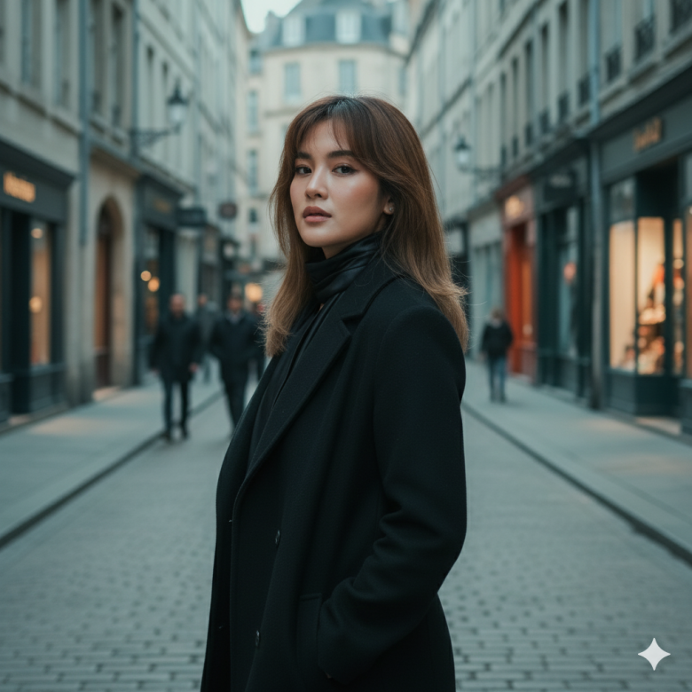 Ultra-realistic cinematic street portrait in a narrow European city street, tall stone buildings, blurred storefronts, pedestrians as soft silhouettes. Subject standing in middle of street, slightly angled, confident gaze. Wearing black overcoat + black scarf, minimal stylish vibe. Lighting: overcast daylight, smooth shadows, balanced contrast. Color grading: cinematic teal-orange, soft desaturated background, natural skin tones. Camera: DSLR 85mm lens, f/1.8, medium waist-up shot, vertical 4:5. Style: cinematic editorial, modern, confident, timeless magazine look