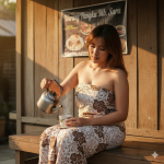 Subject: Edit a super-realistic, HD-quality photo with warm sunset reflections and balanced contrast, pretty face, indonesian, with thin make up, large-chested.