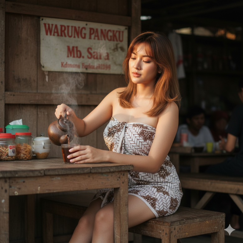 There is banner text on wooden wall writed “Warung Pangku Mb. Sara” , the camera angle is from above at front side the main subject. Overal scene is capturing subject’s high detailed skin textures, pro photograph, 8k.