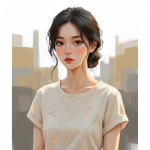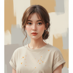 cinematic semi‑realistic anime portrait, delicate young woman, head‑and‑shoulders, centered, neutral expression, large glossy brown eyes, soft porcelain skin with a faint blush, coral lips, dark wavy hair in a loose messy low bun with flyaway strands, wearing a light‑beige t‑shirt with rolled sleeves and tiny orange paint splatters, soft diffuse daylight, warm rim light, painterly brushwork, high‑key minimal background with abstract ochre and gray geometric brush strokes, shallow DOF, 85mm look —ar 2:3 —style raw —v 6 —s 150
